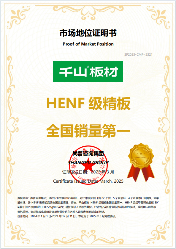 “見(jiàn)山·見(jiàn)未來(lái)”千山板材2025全國(guó)經(jīng)銷(xiāo)商峰會(huì),尚普咨詢(xún)集團(tuán)曹頡先生親臨峰會(huì)現(xiàn)場(chǎng),為千山板材帶來(lái)極具分量的權(quán)威認(rèn)證——千山板材HENF級(jí)精板全國(guó)銷(xiāo)量第一!再次印證了千山板材在環(huán)保家居領(lǐng)域的領(lǐng)先地位。作為中國(guó)最具領(lǐng)導(dǎo)力和權(quán)威性的認(rèn)證公司,尚普咨詢(xún)是中國(guó)最早成立的咨詢(xún)公司之一,也是首批取得國(guó)家統(tǒng)計(jì)局涉外調(diào)查許可資質(zhì)