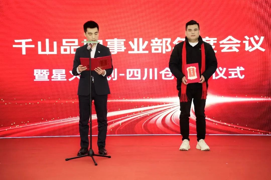 上午11點,直營倉啟動儀式正式開始,王總宣讀四川直營倉任命書:曹全震任千山品牌事業部四川直營倉總經理,滿彬、閆志玉任千山品牌事業部四川直營倉大區經理。