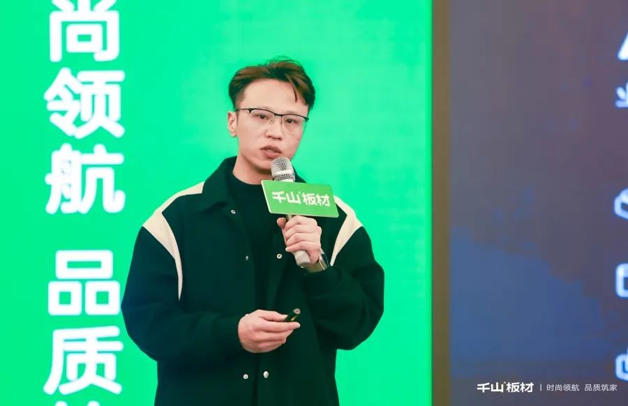 銷售部大區經理王殿忠詳細介紹了千山板材的產品體系。2024年,千山產品體系已全面升級,涵蓋大實木刨片板、小實木刨片板、多層板、實木板四大品類,擁有木紋、純色、布紋石紋、高定、數碼、門板6大系列花色,一站式滿足整家定制的需求。
