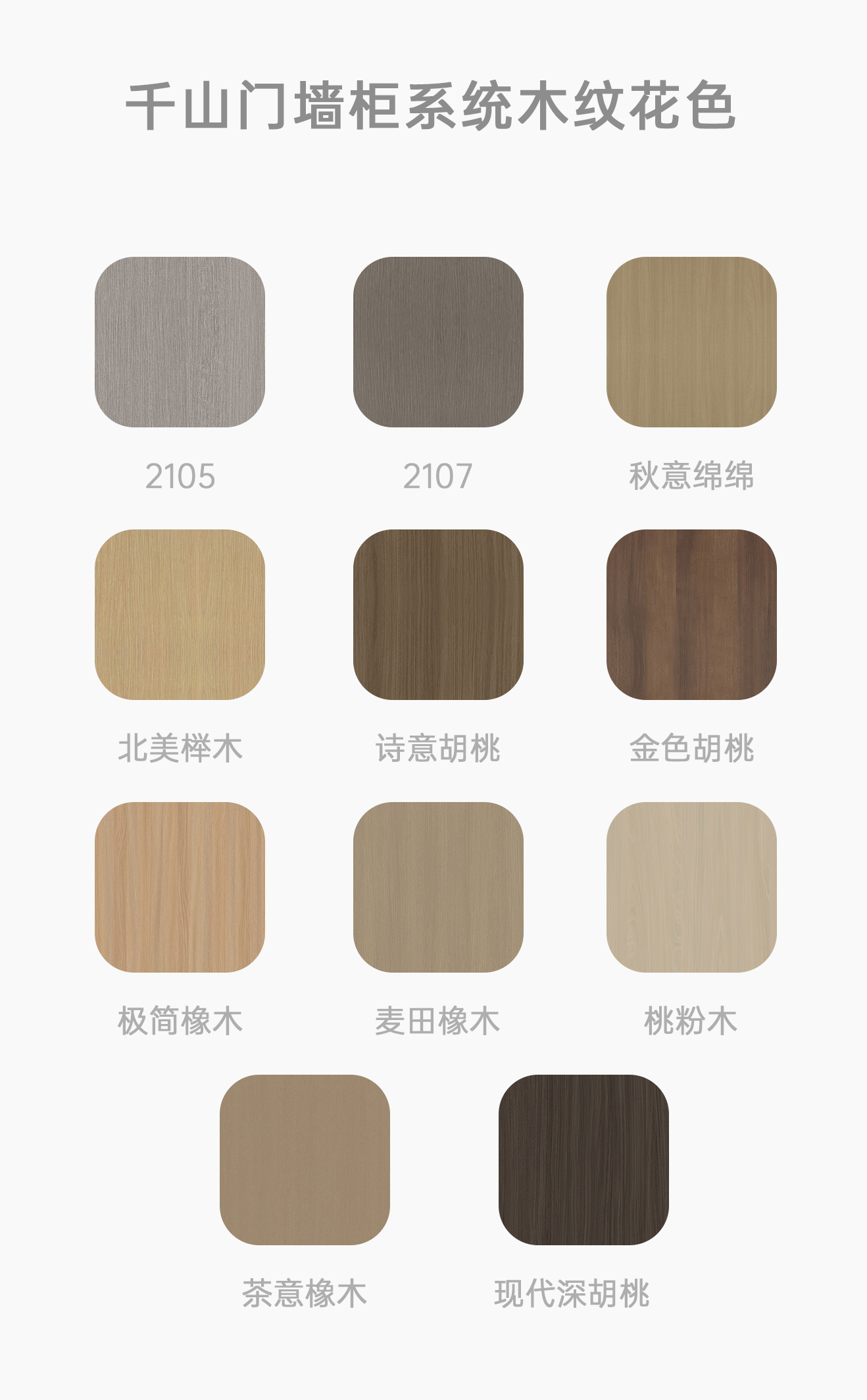 潮流色彩的呈現是門墻柜一體設計的重點,千山門墻柜系統23款極致色彩實現審美升級,滿足極簡、現代、中式等多樣風格的家裝需求。