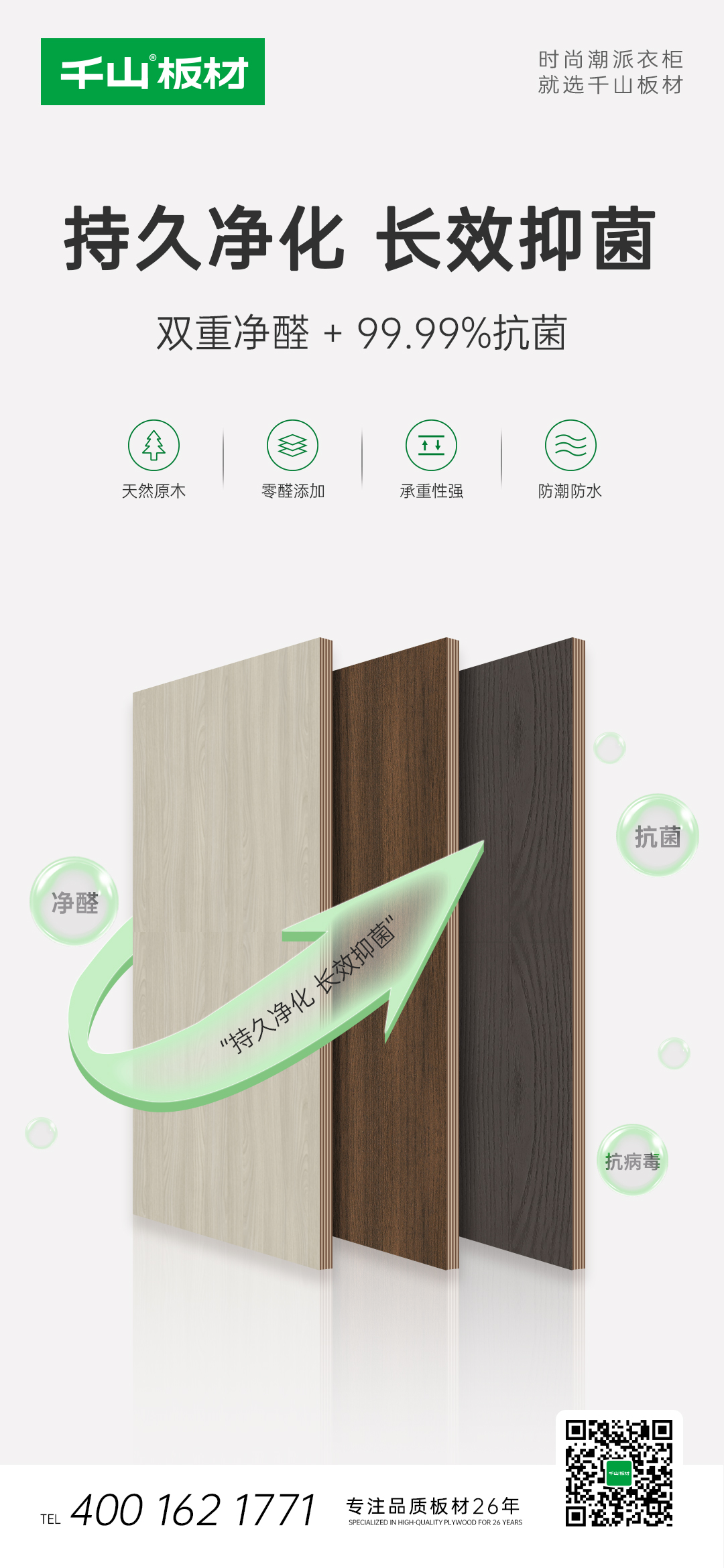 凈醛多層板擁有凈醛抗菌抗病毒超強飾面,能夠主動捕捉甲醛,并將其分解為二氧化碳和水,持久凈化室內(nèi)空氣。通過抗菌抗病毒活性成分,抑制大腸桿菌、金黃色葡萄球菌等微生物生長,抗菌率及抗病毒活性率>99.9%,讓健康更“凈”一步!