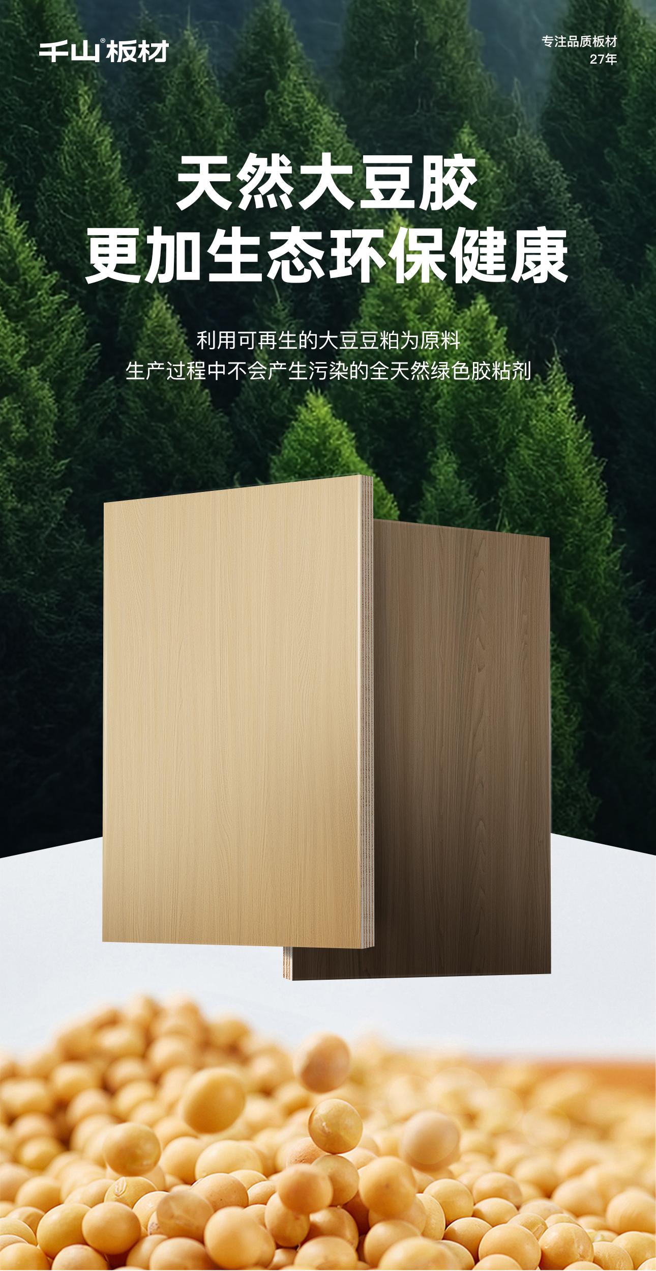 千山大豆膠板材利用大豆分子改性技術,解決傳統大豆膠的耐水性、膠合性缺陷,具有更好地粘合性能,提升了板材的膠合強度、耐水性及靜曲強度,保證板材的抗變形、防潮防霉、不易老化性能,延長使用壽命。