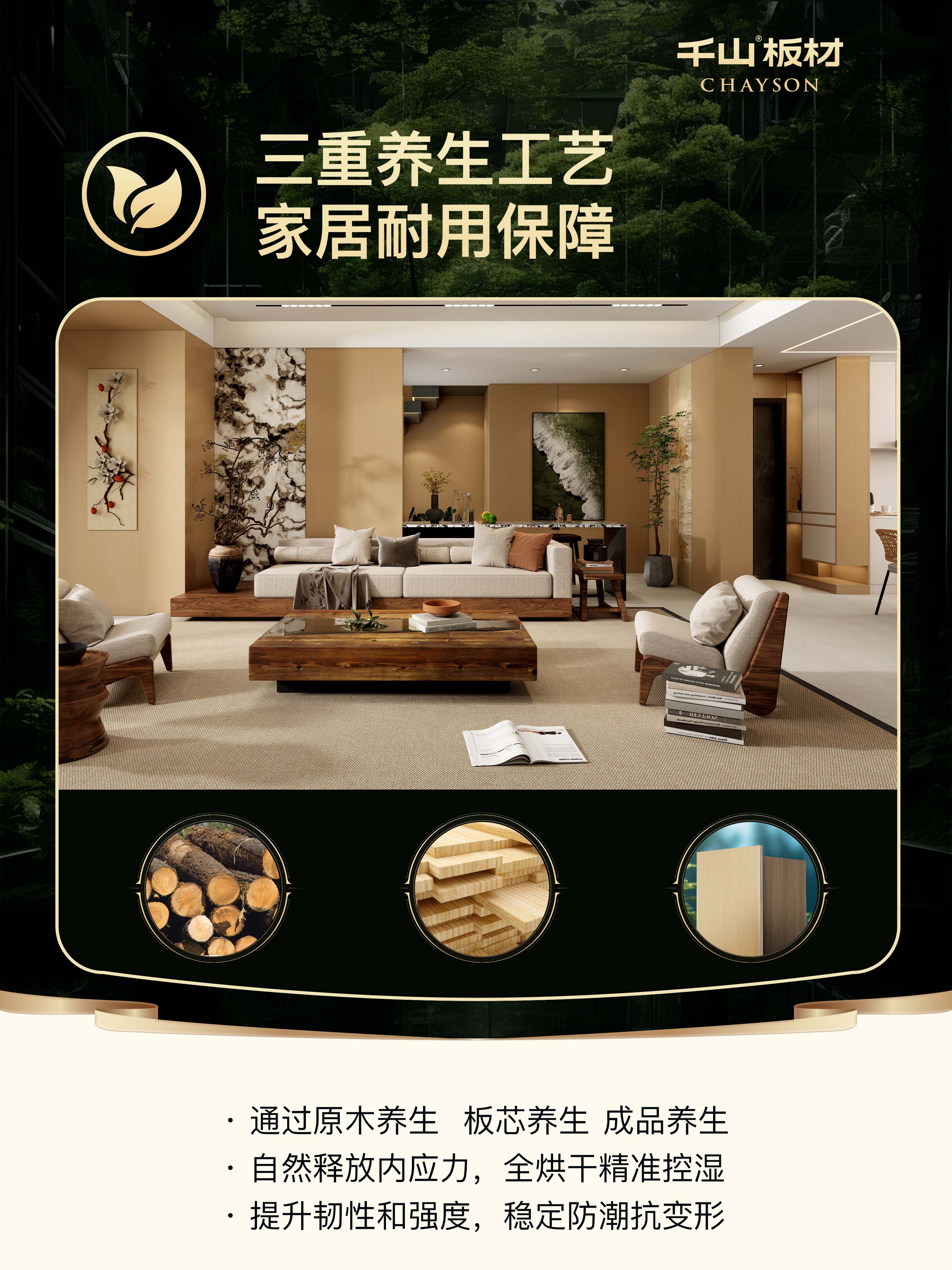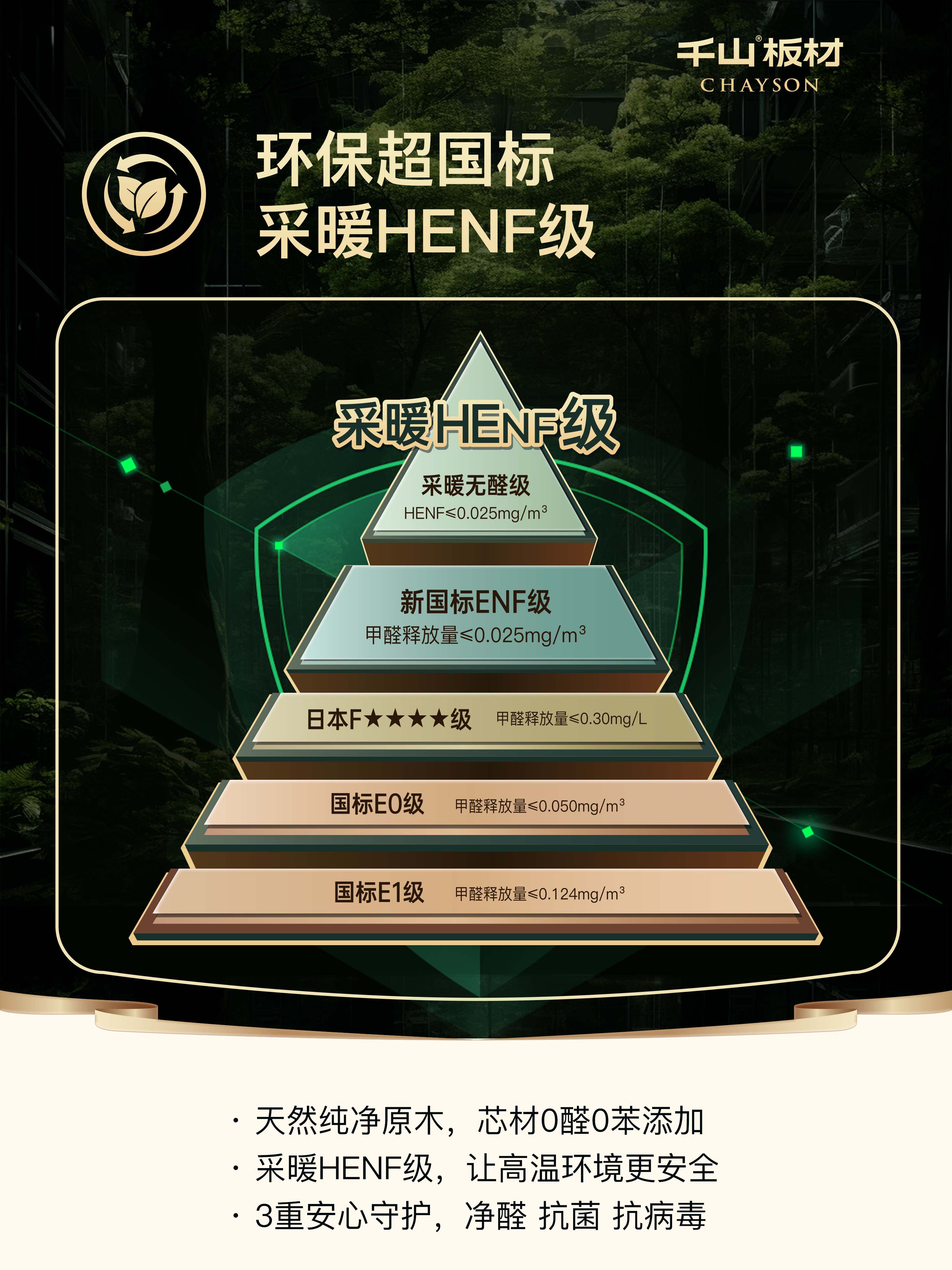 千山原木板質地天然,綠色0醛0苯添加,環保達采暖HENF級,融入凈醛、抗菌、抗病毒功能工藝,讓家不止于美觀,更是一方安心健康的守護。